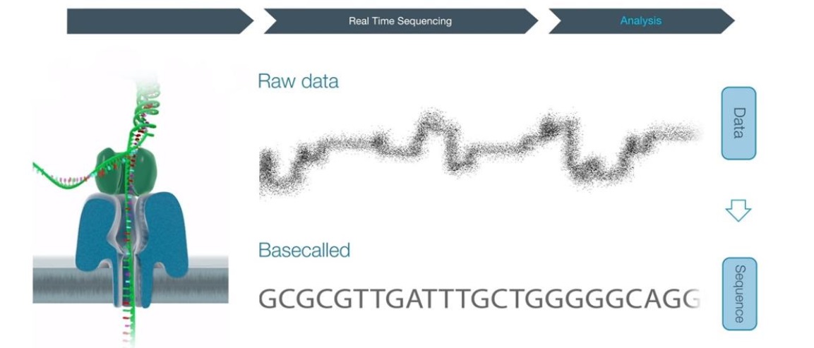 近年来,随着高通量测序技术的发展,三代测序逐渐成为基因组研究的新兴手段。Pacbio、 Nanopore 等第三代测序技术有效的解决了二代测序读长短,无法跨过基因组高重复区域的问题。当下, Nanopore 测序技术作为三代测序的后起之秀,因其读长长、产出高、价格低的优势开始被广泛应用于测序界。该平台利用纳米孔进行实时测序,没有读长限制,可以直接读取超长片段的序列信息,得到超长的 reads。 Nanopore 测序即纳米孔测序,其原理是:纳米孔蛋白作为生物传感器,插入由合成聚合物形成的膜中。此外,核酸分子会与马达蛋白(Motor Protein)连接,该马达蛋白一方面对双链进行解链,使核酸单链在电泳的作用下通过特定的纳米孔蛋白,另一方面可控制 DNA/RNA 分子的移动速度,保证碱基逐一地穿过纳米孔,产生稳定可靠的电信号。由于不同碱基的带电性质不同,通过检测电信号的差异就能检测出通过纳米孔的碱基类别,实现测序